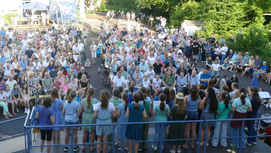 Querflöte, Saxophon, Klarinette, Trompete, Fagott und Horn, Violine, Violoncello, Gitarre, Bass, Piano, Drums und Singstimmen in allen Tonhöhen erklangen am Abend des 09.07.2024 auf dem Schulhof der Schönstätter Marienschule. Schülerinnen aller Klassenstufen standen beim diesjährigen Sommerkonzert auf der Bühne, Musiklehrerinnen dirigierten Chöre und Orchester, Kunstlehrerinnen leiteten die Choreografie der Tanzgruppen. Viele Zuschauerinnen und Zuschauer genossen die Serenade bei sommerlichen Temperaturen und honorierten das Engagement der Darbietenden mit großem Applaus. Mehr