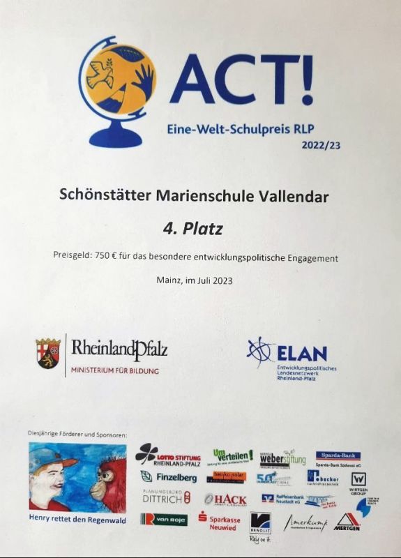 Von 15 Bewerbungen wurde die Artenschutz-AG der Schönstätter Marienschule von der Jury des ACT – Eine Welt Schulpreises auf den 4. Platz gewählt. Dafür erhalten wir ein Preisgeld in Höhe von 750€. Das freut die Schülerinnen der AG sehr, vor allem da der Kauf eines neuen Terrariums zur Ausweitung der Zucht von bedrohten Amphibien- und Reptilienarten geplant ist. Aber auch für andere Projekte, wie einen artenfreundlichen Schulhof oder die Vogelfütterung kann das Geld sinnvoll eingesetzt werden! Klaus Ullenbruch, Artenschutz-AG