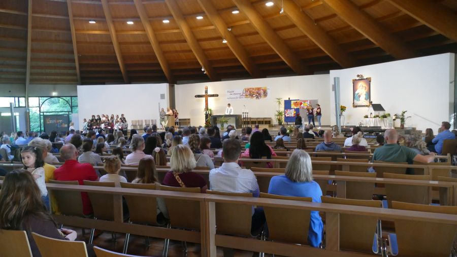 Über 100 Fünftklässlerinnen erlebten am 05.09.2023 ihren ersten Schultag an der SMS. Die neuen Schülerinnen und ihre Familien versammelten sich am Morgen in der Pilgerkirche in Schönstatt. Den Einschulungsgottesdienst hatten die Paten der Fünftklässlerinnen zusammen mit Frau Humberg vorbereitet. Der Gottesdienst stand unter dem Motto „Das neue Schuljahr kommt ins Rollen“.