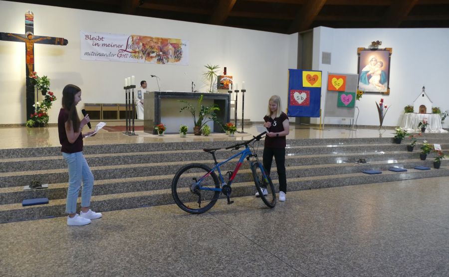 Die Patinnen, Neuntklässlerinnen, erläuterten anhand eines Fahrrades, was alles zu einem gelungenen Schulstart und einer erfolgreichen Schullaufbahn dazugehört. Eine Janosch-Geschichte mit Tiger und Bär brachte einen „Wegweiser“ ins Spiel.