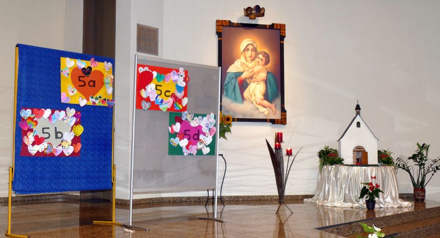 Anknüpfend an das Evangelium, in dem Jesus von sich sagt, dass er der Weg und die Wahrheit und das Leben sei, erläuterte Pater Herter, der dem Wortgottesdienst vorstand, die Bedeutung der Weggemeinschaft mit Jesus. In der Schule lernen wir – so Pater Herter – miteinander umzugehen und Herausforderungen gemeinsam zu bestehen. Das Miteinander, das in der Marienschule großgeschrieben würde, konkretisiere sich zum Beispiel in der Unterstützung der Fünftklässlerinnen durch die Patinnen. Am Einschulungstag spürten die jungen Schülerinnen, dass sie nicht allein sind, sondern dass viele hinter ihnen stünden. Pater Herter wies auch in auf das Marienbild von Schönstatt hin. Auf diesem Bild, das auch in den Klassenzimmern hängt, zeige Maria auf Jesus. Im Kind auf ihren Armen könne sich auch jeder von uns wiederfinden.