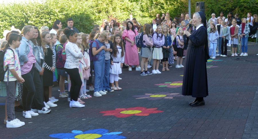 Das Einschulungsprogramm wurde auf dem Schulhof der Marienschule fortgesetzt. Die Direktorin, Sr. M. Gabriele, begrüßte die neuen Schülerinnen und ihre Familien.