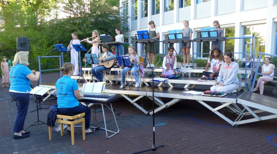 Auf der Bühne stellten Sechstklässlerinnen die musischen Fächer „Orchester“, Bildende Kunst“ und „Chor“ vor.