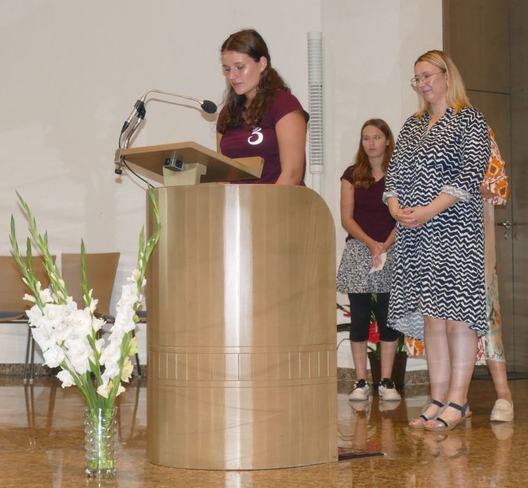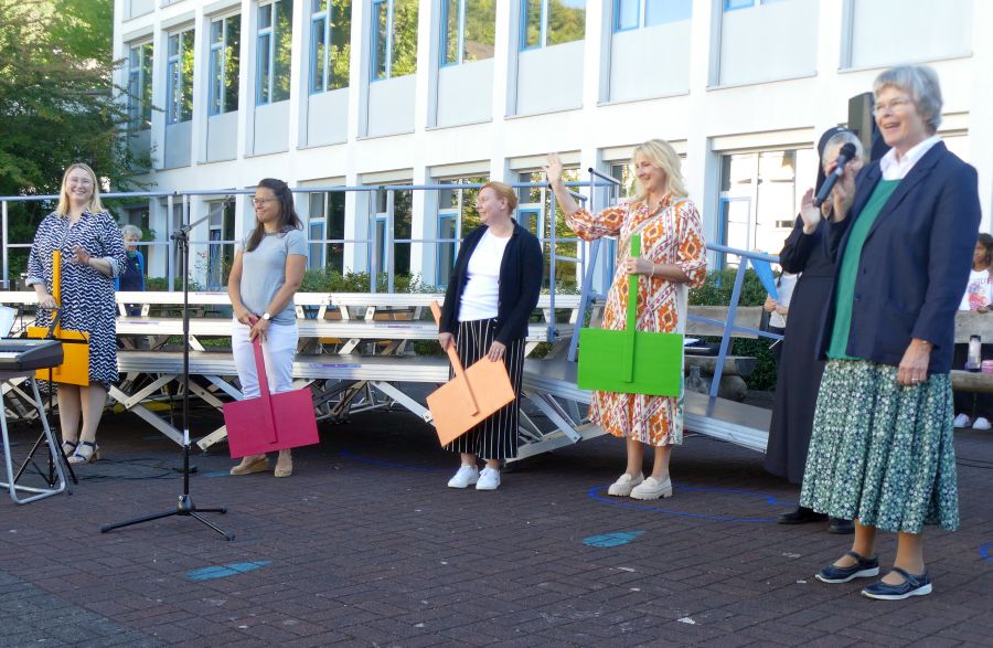 Nach dem Bühnenprogramm bat die Leiterin der Realschule plus, Sr. M. Verena, die Klassenlehrerinnen der Fünfer auf die Bühne und stellte Frau Humberg, Frau Hasselwander, Frau Schüler und Frau Schambortski vor.