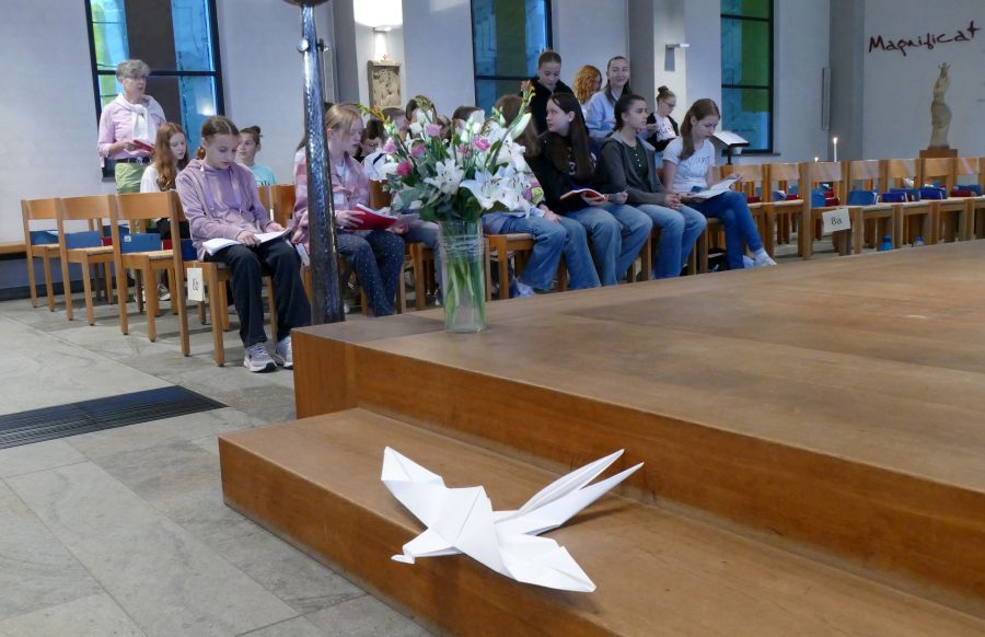 Der Papiervogel, den eine Schülerin für den Gottesdienst gebastelt hatte, sprach seine eigene Sprache. Die Stufenmesse dauerte etwas länger als eine Schulstunde. Dafür hatte man aber auch Zeit und Ruhe sich auf Themen einzulassen, die nicht nur zu Beginn eines Schuljahres bedeutsam sind.