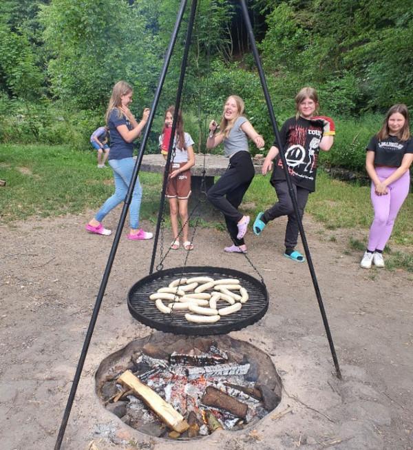 Am 14.6.23 ging es für uns auf Klassenfahrt ins Brexbachtal. Am frühen Morgen trafen wir uns am Parkplatz der Feuerwehr Bendorf Mülhofen um die letzten Sachen einzupacken um dann loszuwandern. Wir gingen ca. eine halbe Stunde zum Georgshaus. Dort packten wir alle Sachen aus und schafften sie auf den Dachboden. Der größte Schock war zunächst, dass nicht mehr genug Trinkwasser im Wassertank war und wir Wasser sparen mussten. Das bedeutete, dass wir die Toilette immer mit Wasser aus dem Bach ausspülen mussten. Aber auch diese Herausforderung haben wir bestens gemeistert. Wir teilten uns in Gruppen auf und gingen Holz sammeln, in den Bach oder spielten auf der Wiese. Für die erste Gruppe ging es dann mit unserem Erlebnispädagogen Oliver Lumma zu den Abseilübungen, die er für uns vorbereitet hatte. Das alles machte riesig Spaß und wir überwanden unsere Ängste. Am Ende legte Oliver, genannt Olli, die Seile auf eine schwerere Strecke und ein paar von uns trauten sich sie zu gehen, wir waren alle danach sehr stolz und konnten mit einem guten Gefühl zurückgehen. Während die einen Abseilübungen gemacht haben, veranstalteten die anderen Kinder eine Wasserschlacht im Bach, wobei wir alle ganz schön nass wurden, selbst die Lehrerinnen machten mit. Am Abend grillten wir Würstchen und aßen dazu selbstgemachten Salat. Hinterher gabs noch Stockbrot und Marshmallows. In der Nacht stand fand dann noch eine kleine Nachtwanderung statt, wobei wir einen kleinen Schatz suchen sollten. Als wir ihn fanden, erwarteten uns drei Mitschülerinnen, die uns erschreckten. Leider erschreckten sich manche so sehr, dass sie anfingen in Panik zu geraten. Wir gingen zu unserem Haus zurück und fielen erschöpft in unser Bett. Am nächsten Morgen frühstückten wir und richteten unsere Sachen für die Heimreise. Wir putzten noch das Haus und machten uns bereit aufzubrechen. Wir wanderten wieder zum Parkplatz zurück. Wir hatten alle sehr viel Spaß! Ella Happe (und Emilia Kessler) 6g