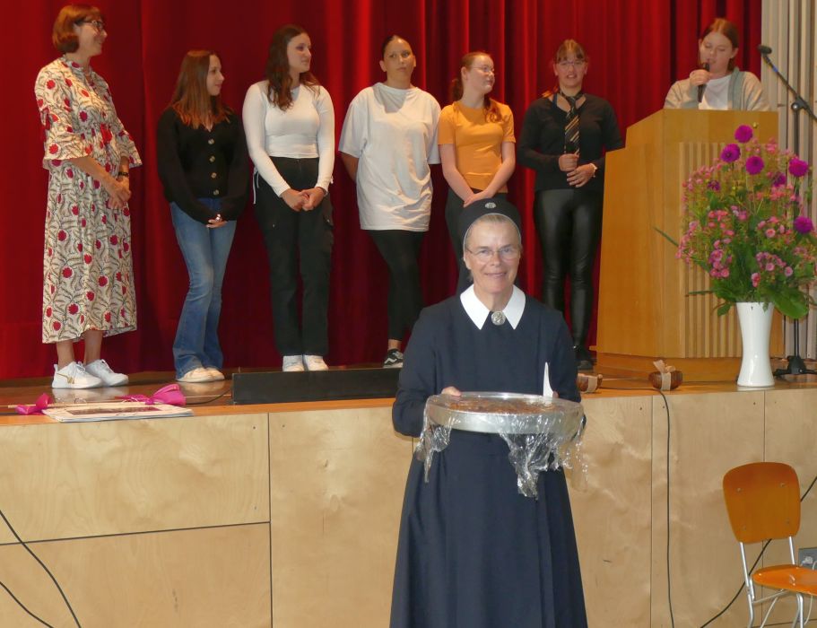 Die Schülersprecherinnen Paula R., Romy B., Chiara N. und Saphira W. hoben hervor, dass Sr. M. Verena sich immer vom Glauben habe leiten lassen und die Schule zum Blühen gebracht habe.