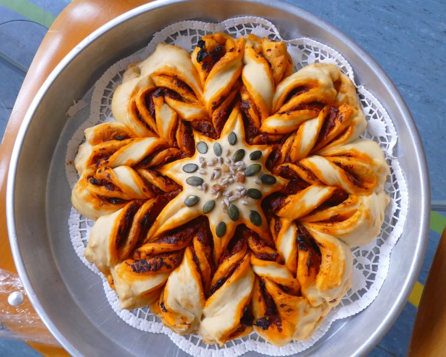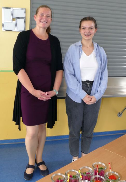 Sr. M. Verena freute sich auch sehr über die Pesto-Blumen, die die Schülerinnen des Wahlpflichtfachs HuS eigens für sie gebacken hatten,