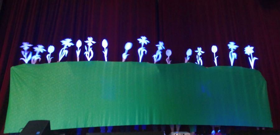 Am Ende des abwechslungsreichen Programms ließ das Lehrerkollegium weiße Blumen mit Hilfe der Schwarzlichttechnik in einem imaginären Garten zu der stimmungsvollen Musik „Morgenstimmung“ von Edvard Grieg wachsen und übergab Sr. M. Verena anschließend einen Präsentkorb mit allen guten Wünschen.