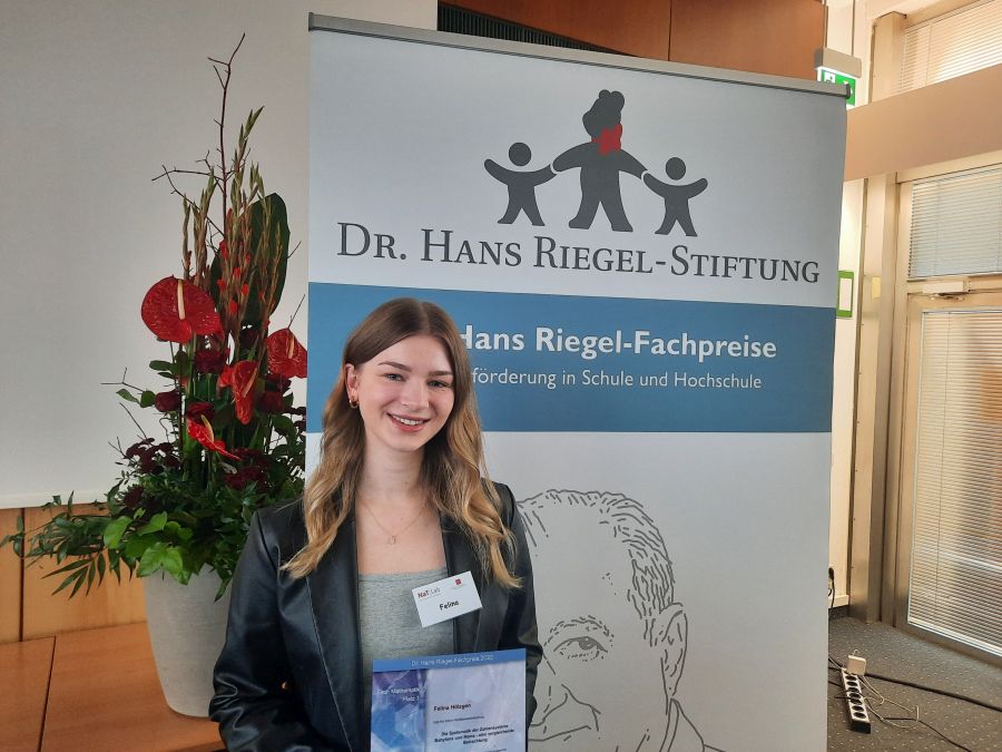 Unter dem Motto „Fertig, Uni, Los“ schreibt die Johannes Gutenberg-Universität Mainz in Zusammenarbeit mit der Dr. Hans-Riegel-Stiftung jährlich einen Wettbewerb zur Prämierung von Facharbeiten in MINT-Fächern aus, in diesem Jahr zum 14. Mal. Eine Auszeichnung erhielt Felina H. (Jahrgangsstufe 13) für ihre Facharbeit zum Thema „Die Systematik der Zahlensysteme Babylons und Roms – eine vergleichende Betrachtung“, sie erhielt den 3. Preis im Fach Mathematik. Insgesamt wurden in den Fächern Mathematik, Informatik, Physik, Chemie und Geographie 15 Preise der Dr. Hans-Riegel-Stiftung zur Talentförderung in Schule und Hochschule vergeben. Am 12. November 2023 fand im festlichen Rahmen im Senatssaal der Naturwissenschaftlichen Fakultät der Universität Mainz die Preisverleihung statt. Frau Dr. Welschof, Leiterin des Schülerlabors NaT-Lab der Uni, und Herr Laffin als Vertreter der Stiftung aus Bonn nahmen die Preisverleihung vor. Prof. Dr. Müller-Stach, Vizepräsident für Forschung und wissenschaftlichen Nachwuchs, gratulierte den Preisträgerinnen. Die Laudatio im Fach Mathematik hielt Frau Prof. Dr. Weiß. Begleitet wurde Felina von der betreuenden Lehrerin der Facharbeit, Dorothee Bürger.