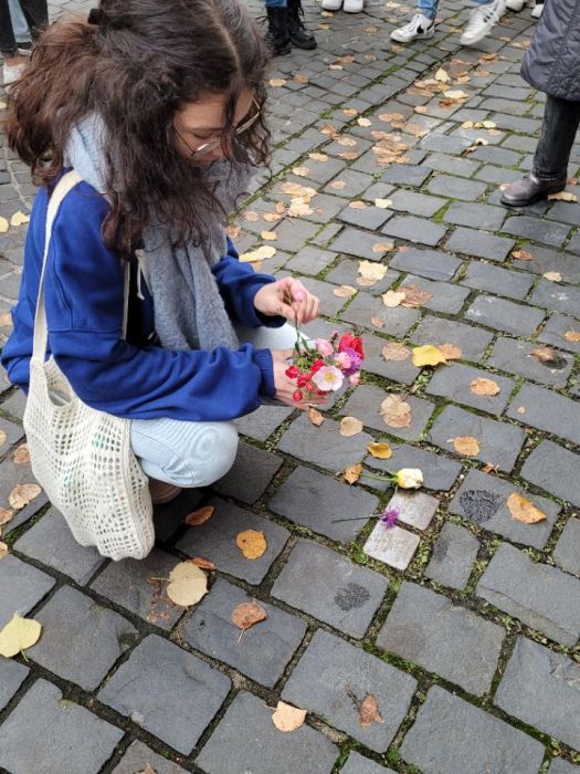 Weiter gedachten wir an den Stolpersteinen am Rathausplatz der ermordeten Familien und legten an einer Stelle stellvertretend Blumen nieder. Die Stolpersteine erinnern an die Wohnorte der Verfolgten im 3. Reich und man findet sie an vielen Orten in Deutschland und anderen Ländern wieder. In Vallendar gibt es über 20 Stolpersteine.