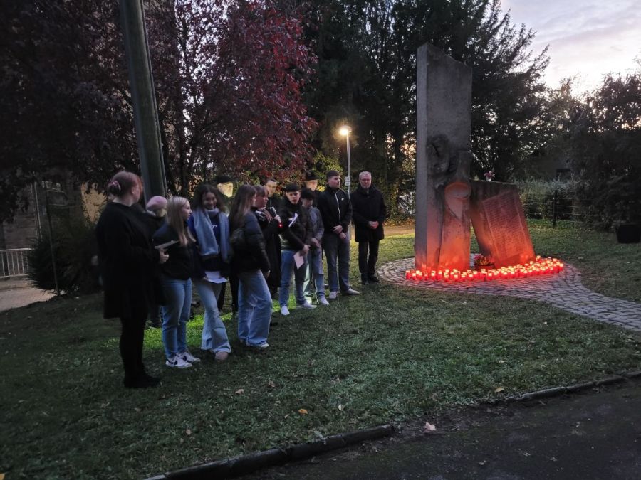 Der Schlusspunkt an diesem 9. November bildete die gemeinsame Veranstaltung um 17 Uhr mit katholischer und evangelischer Kirche, mit dem Stadtbürgermeister und Vertretern der demokratischen Parteien und Mitbürgern der Stadt. Auch die Jugendlichen der „Konrad-Adenauer-Realschule plus“ vom Mallendarer Berg hatten sich – wie wir – Gedanken zu diesem besonderen Tag gemacht und trugen sie vor. Gemeinsam stellten die Schüler beider Schulen die brennenden 99 Kerzen im Gedenken an die 99 ermordeten Juden zu den Namen am Mahnmal. Die Klassen der Marienschule hatten in den Wochen zuvor im Musikunterricht mit Frau Garmacea ein jüdisches Friedenslied eingeübt. Dieses bildete bei dieser abendlichen Veranstaltung einen wirklich würdigen und nachdenklichen Schlusspunkt.