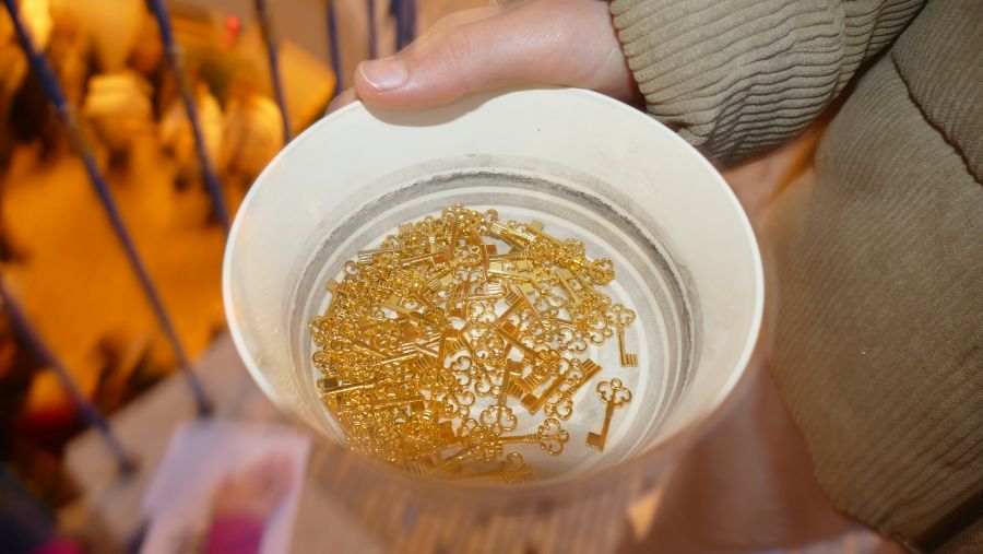 Spannend wurde es, als das Adventskalendertürchen mit dem Schlüssel geöffnet wurde. Über 200 kleine goldene Schlüssel kamen zum Vorschein. Alle Fünft- und Sechstklässlerinnen konnten sich einen kleinen Schlüssel mitnehmen zur Erinnerung an die Adventseinstimmung.