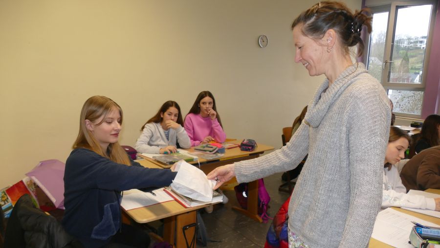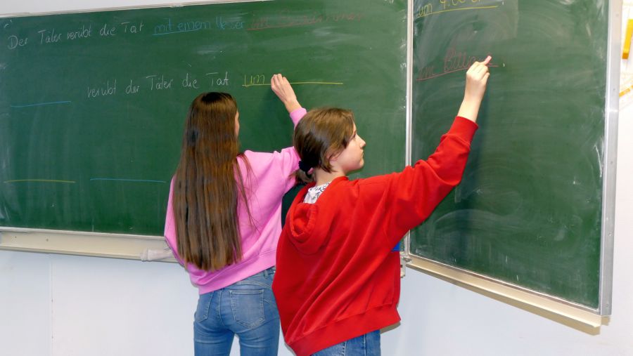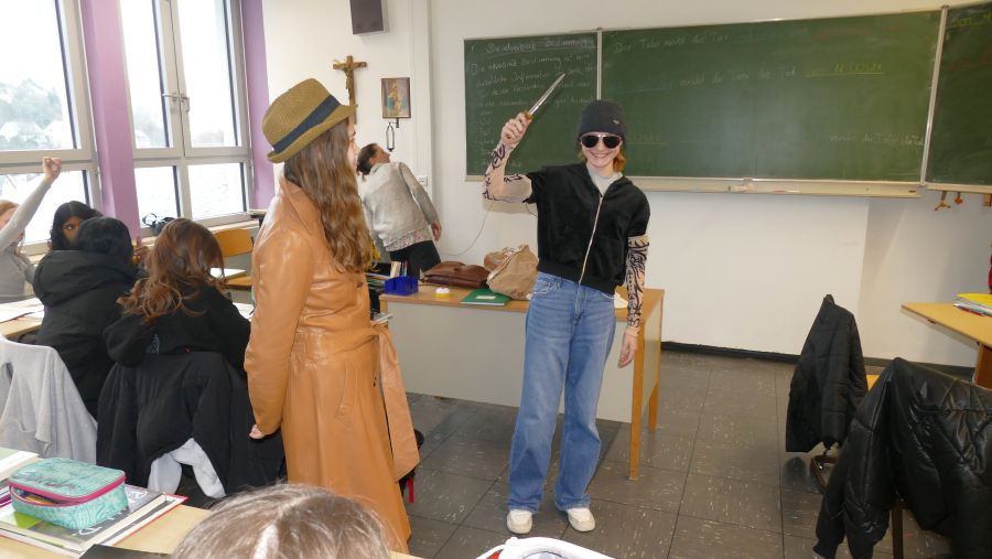 "Inspektor, welche Informationen haben wir?" - Grammatik einmal anders · 16. März 2024Ohne Informationen, die die adverbialen Bestimmungen liefern, würde kein Kriminalfall gelöst! Mit diesem Wissen führte „Inspektor“ Jennifer am 11.03.2024 ihre Ermittlungen durch. Die Schülerinnen der 7d halfen tatkräftig mit und zogen bei Deutschlehrerin Frau Weißenfels Tatzeit und Tatort. „Täterin“ Leni durfte das Tatwerkzeug wählen. Die übrigen Schülerinnen halfen ebenfalls dabei, mit den ermittelten adverbialen Bestimmungen der Zeit, des Ortes und des Mittels das Tafelbild zu vervollständigen.