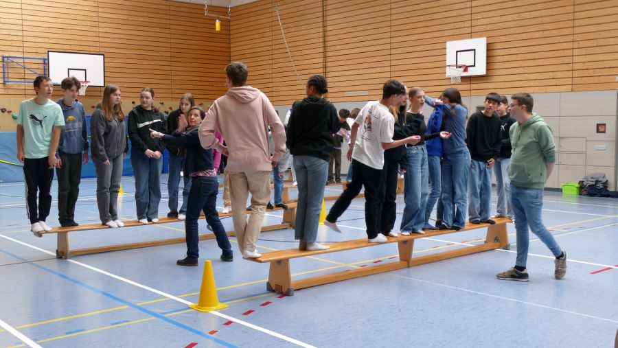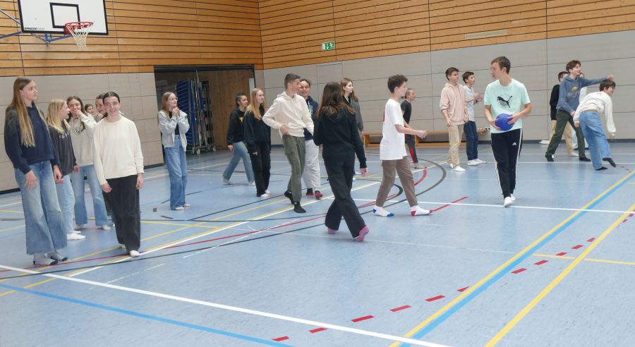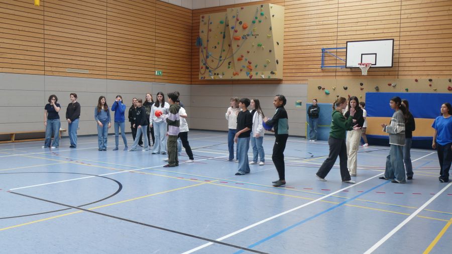 Sportliche Begegnung am ersten Tag des Austausches · 6. April 2024Am ersten Tag nach ihrer Ankunft in Koblenz besichtigen die 26 französischen Austauschschülerinnen und -schüler die Marienschule und tauschten sich mit ihren Lehrerinnen und Lehrern über ihre Erfahrungen aus. Dann hieß es für sie, zu zweit oder zu dritt von der dritten bis zur sechsten Stunde am regulären Unterricht teilzunehmen. Einige standen sogar vorne an der Tafel und wirkten aktiv mit, etwas im Französischunterricht bei Frau Schräder. Nach dem gemeinsamen Mittagessen in der Mensa blieben die Gastgeberinnen und ihre Austauschpartner bis 16.30 Uhr zu einem Spielenachmittag in der Schule.