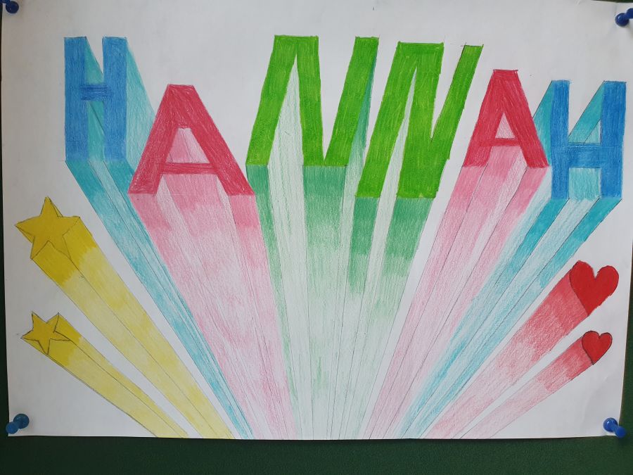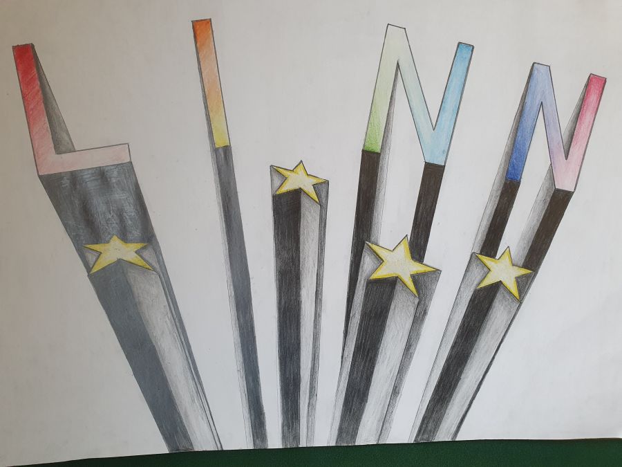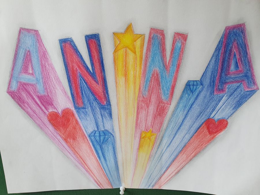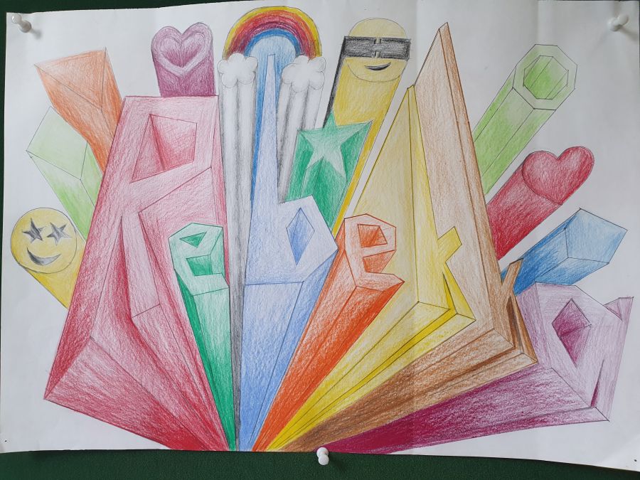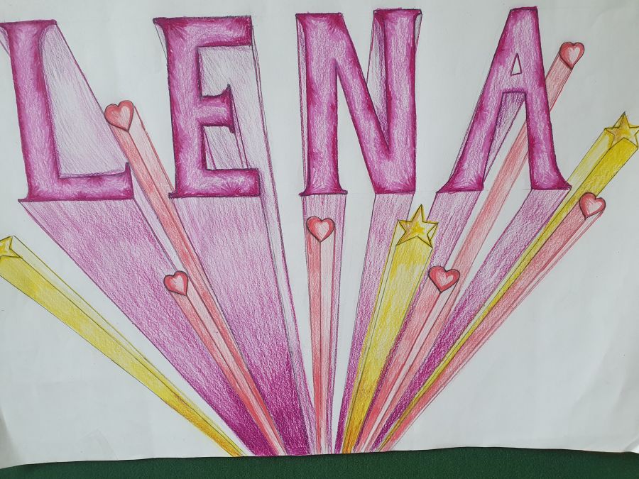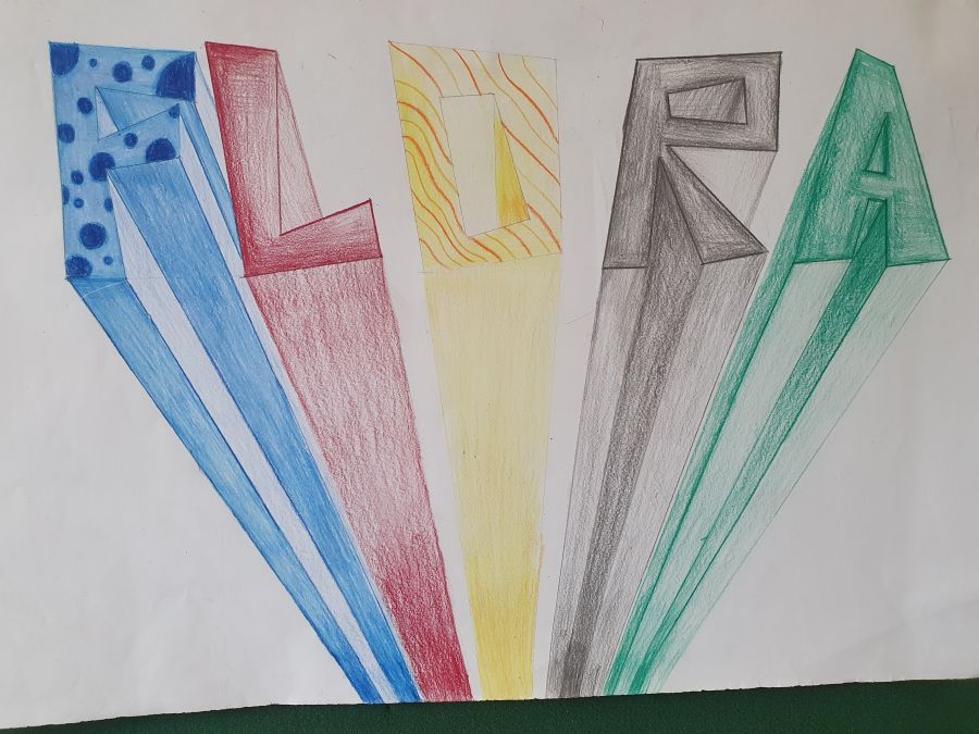 „My name is“ …Schrift und Perspektive Die Schülerinnen und Schüler der 8d gestalteten in dieser Unterrichtseinheit ihren Namen zentralperspektivisch und erlernten dabei, wie sie auf einer Ebene Tiefe darstellen können. De jeweiligen Flächen der Balkenschrift wurden mit Buntstiften ausgemalt. Um weitere räumliche Tiefenwirkung zu erzielen, erhielten Flächen, die nach unten zeigen, einen von den Seitenflächen abweichenden Tonwert oder Helligkeitsgrad.