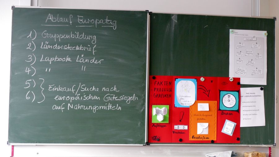 Es wurden Plakate zum Thema Europa gestaltet und Referate gehalten, es gab eine Europa-Flaggen-Rallye, Lapbooks wurden erstellt, ein EU-Spiel entwickelt, die Europa-Hymne gesungen und Volkstänze aus den verschiedenen Ländern geübt.
