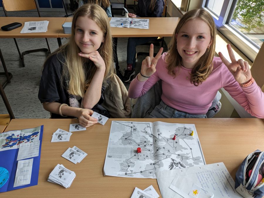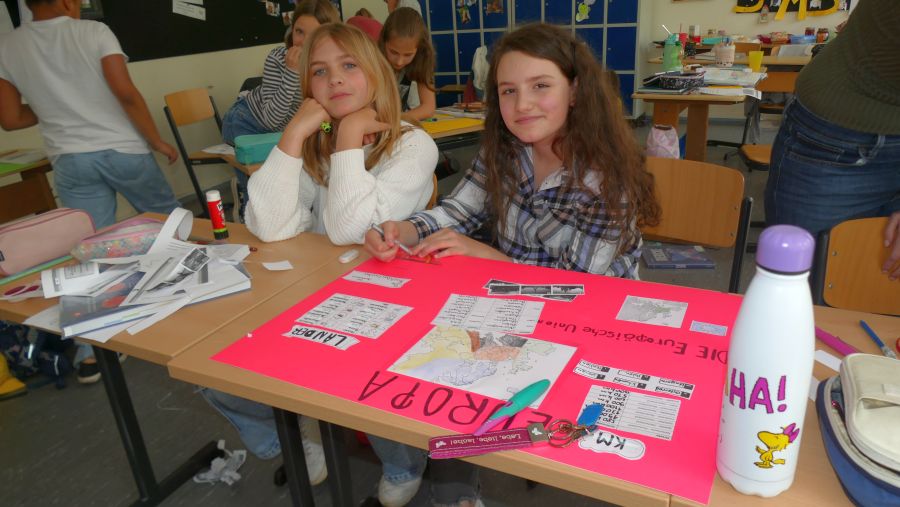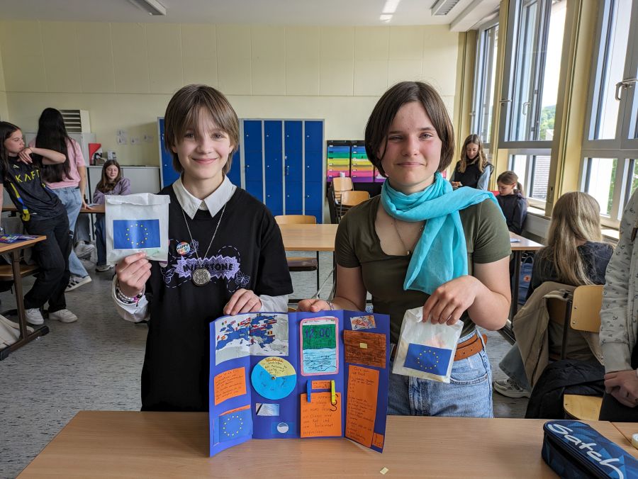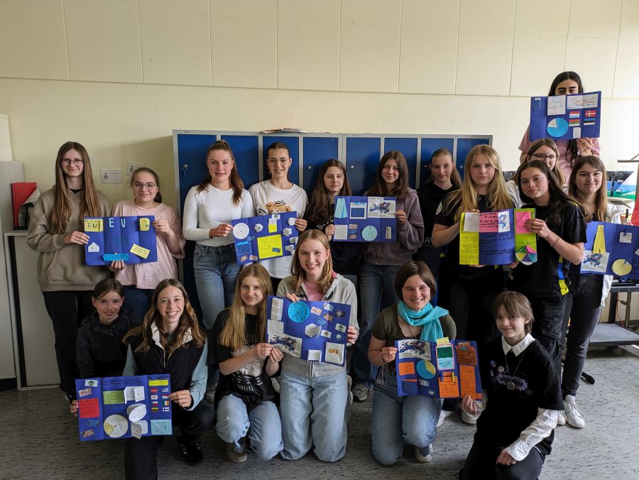 Schülerinnen einer 8. Klasse erstellten Lapbooks zur EU und auch ein EU-Spiel zum Zeitvertreib.