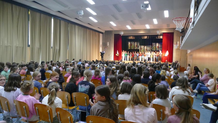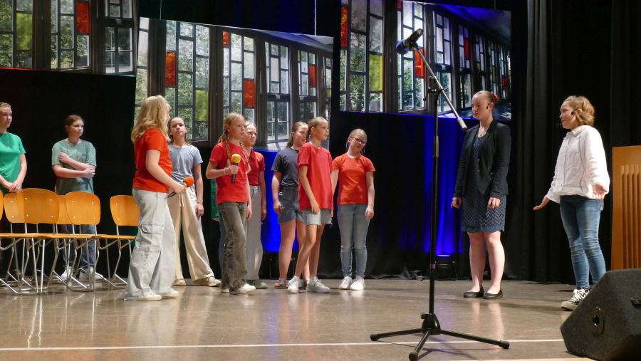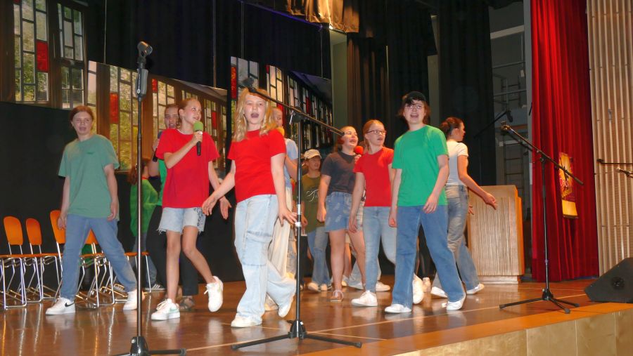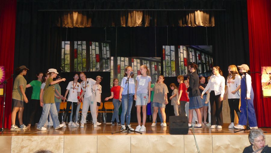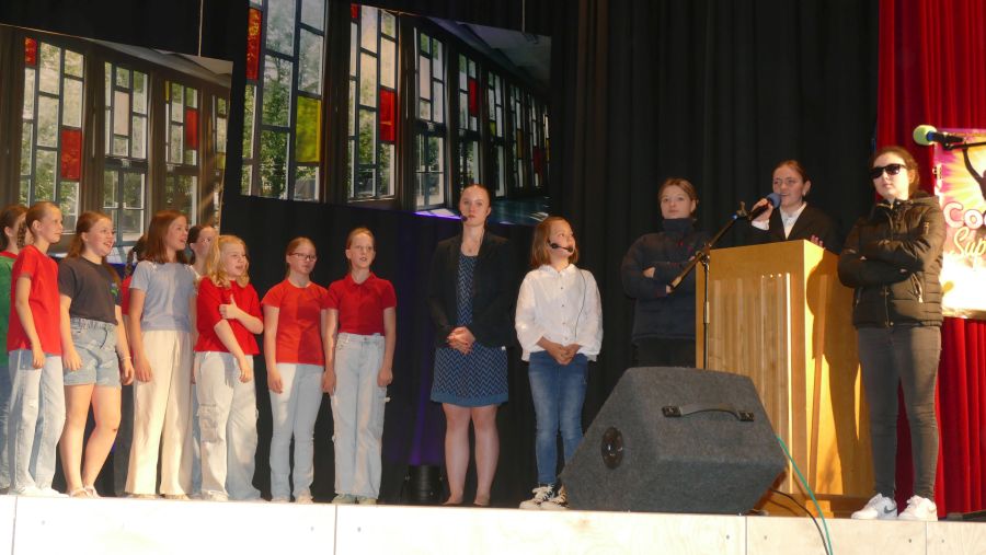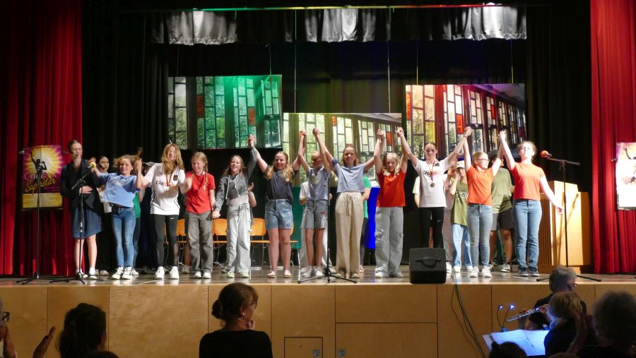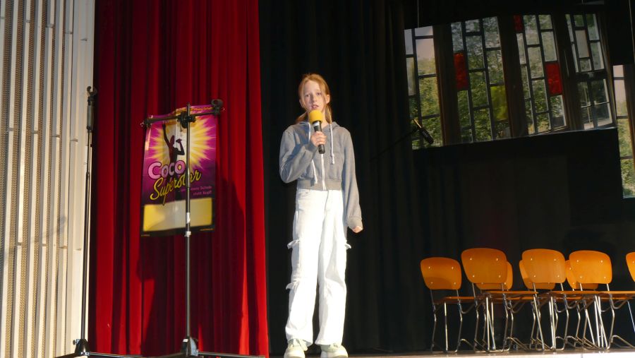 25 sangeskräftige Schülerinnen der Musical-AG aus den Klassenstufen 5 bis 10 und eine professionell spielende Band aus ehemaligen und aktuellen Kollegen sowie Eltern machten die Aula der Marienschule am Abend des 30.06. und am Vormittag des 01.07.2024 zu einer ganz großen Bühne. Nach mehr als einem halben Jahr Probenzeit unter der Leitung von Frau Normann-Bühler und Frau Jocks wurde das Musical „Coco Superstar“ aufgeführt. Es geht um niemand Geringeres als um Coco, den neueste Stern am Casting-Himmel. Coco gibt ein Konzert in der Stadt und eine aus der Schule darf Coco backstage hinter der Bühne besuchen. Nur – wer darf das sein. Es gibt ein großes Gerangel in der Schülerschaft: zwischen Mädchen und Jungen, zwischen Fans und Show-Begeisterten. Für die Direktorin ist es selbstverständlich, dass nur der- oder diejenige mit den besten Zensuren dafür in Frage kommt – das sehen ihre Schülerinnen und Schüler allerdings ganz anders. Und so liefern sich Naturwissenschaftlerinnen, Sportlerinnen, Sprachgenies und Künstlerinnen einen wortreichen (Gesangs-) Wettstreit. Eltern, Freunde, Lehrer gedankten sich bei den Schauspielerinnen am Ende mit einem überschwänglichen Applaus und waren einhellig der Meinung: Das war eine großartiges Leistung!!!!!