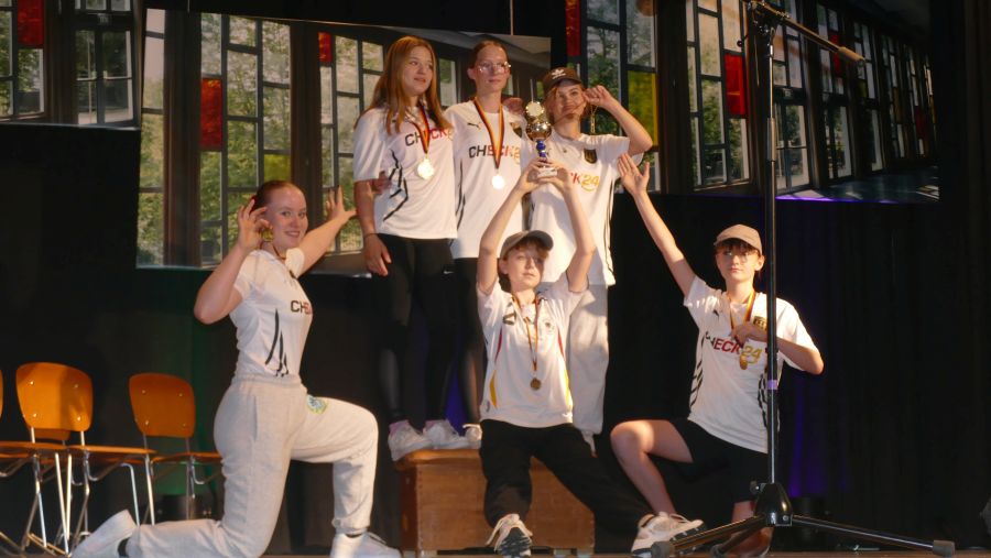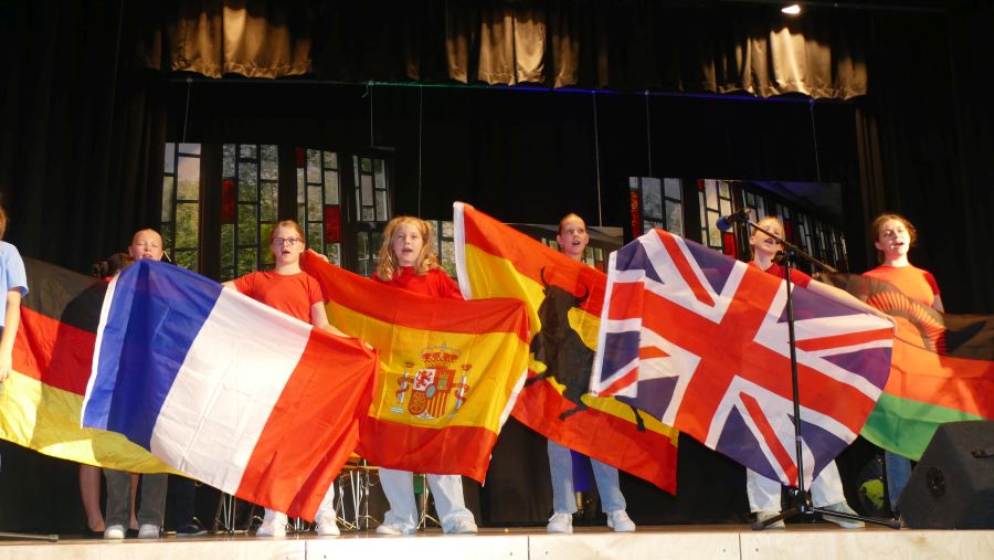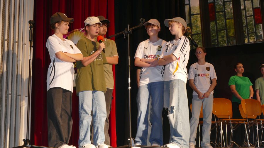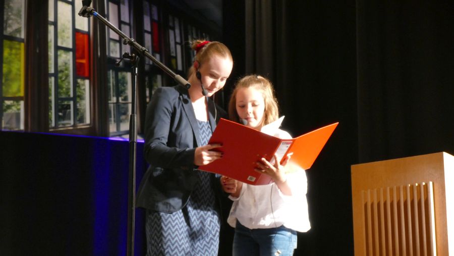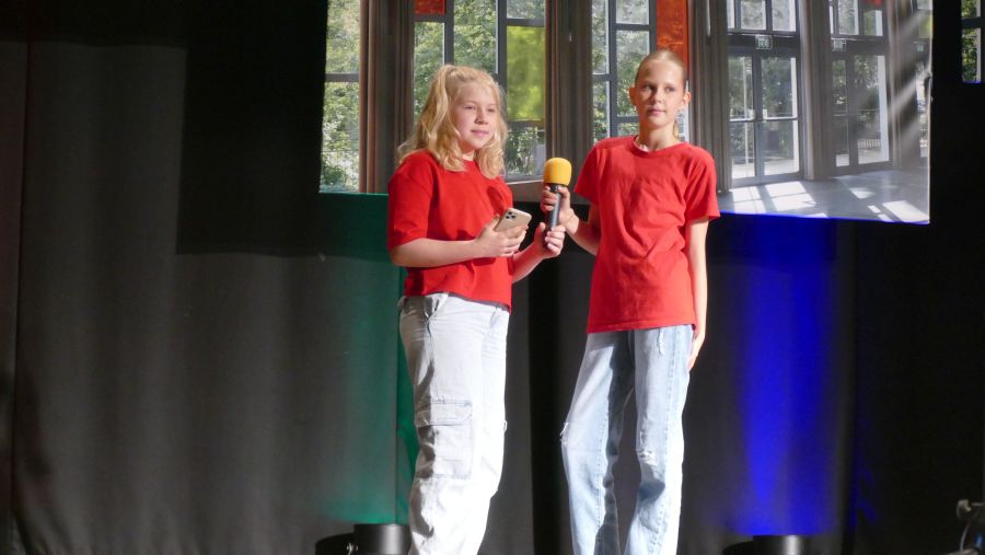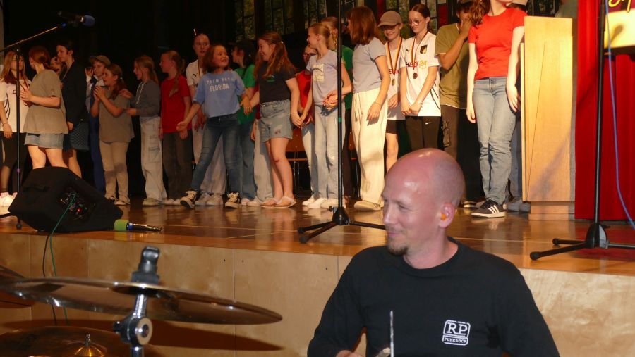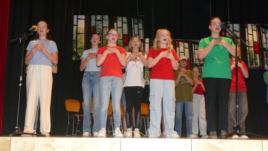 25 sangeskräftige Schülerinnen der Musical-AG aus den Klassenstufen 5 bis 10 und eine professionell spielende Band aus ehemaligen und aktuellen Kollegen sowie Eltern machten die Aula der Marienschule am Abend des 30.06. und am Vormittag des 01.07.2024 zu einer ganz großen Bühne. Nach mehr als einem halben Jahr Probenzeit unter der Leitung von Frau Normann-Bühler und Frau Jocks wurde das Musical „Coco Superstar“ aufgeführt. Es geht um niemand Geringeres als um Coco, den neueste Stern am Casting-Himmel. Coco gibt ein Konzert in der Stadt und eine aus der Schule darf Coco backstage hinter der Bühne besuchen. Nur – wer darf das sein. Es gibt ein großes Gerangel in der Schülerschaft: zwischen Mädchen und Jungen, zwischen Fans und Show-Begeisterten. Für die Direktorin ist es selbstverständlich, dass nur der- oder diejenige mit den besten Zensuren dafür in Frage kommt – das sehen ihre Schülerinnen und Schüler allerdings ganz anders. Und so liefern sich Naturwissenschaftlerinnen, Sportlerinnen, Sprachgenies und Künstlerinnen einen wortreichen (Gesangs-) Wettstreit. Eltern, Freunde, Lehrer gedankten sich bei den Schauspielerinnen am Ende mit einem überschwänglichen Applaus und waren einhellig der Meinung: Das war eine großartiges Leistung!!!!!